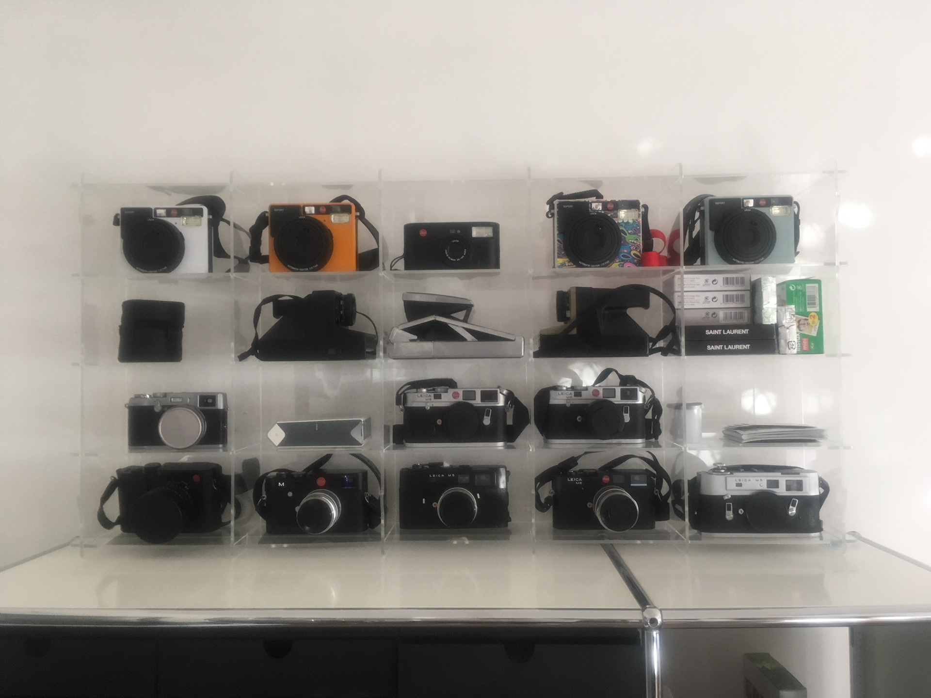 ...seht ihr hier mal alle präsentiert. Für alle Leicas und Polaroidkameras habe ich jetzt auch einen Schaukasten. Nicht nur zum Anschauen. Es sind alle Kameras im Einsatz und das soll auch so bleiben.